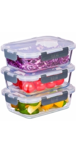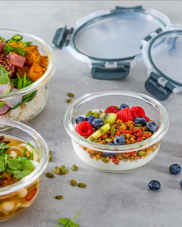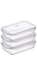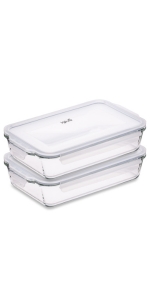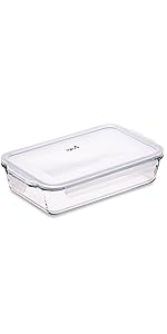 Verre réutilisable 30,8 cm (l) x 18,4 cm (w) x 6,2 cm (h) (Base en verre uniquement) Volume 2,2L Facile à verrouiller - LockTabs sur 4 côtés Joints en silicone amovibles – super hygiénique Couvercles transparents - pour une présentation visuelle parfaite