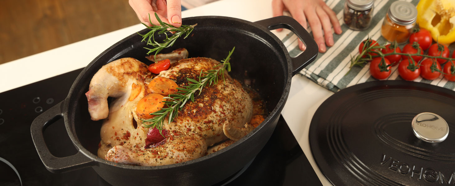 La Cocotte en Fonte de haute qualité Veohome vous garantit une cuisson douce et homogène qui préserve les saveurs authentiques pour des plats toujours réussis ! Mijotés, braisés, rôti au four - les soupes, ragoûts, civets, rôtis n'auront plus aucun secret pour vous.