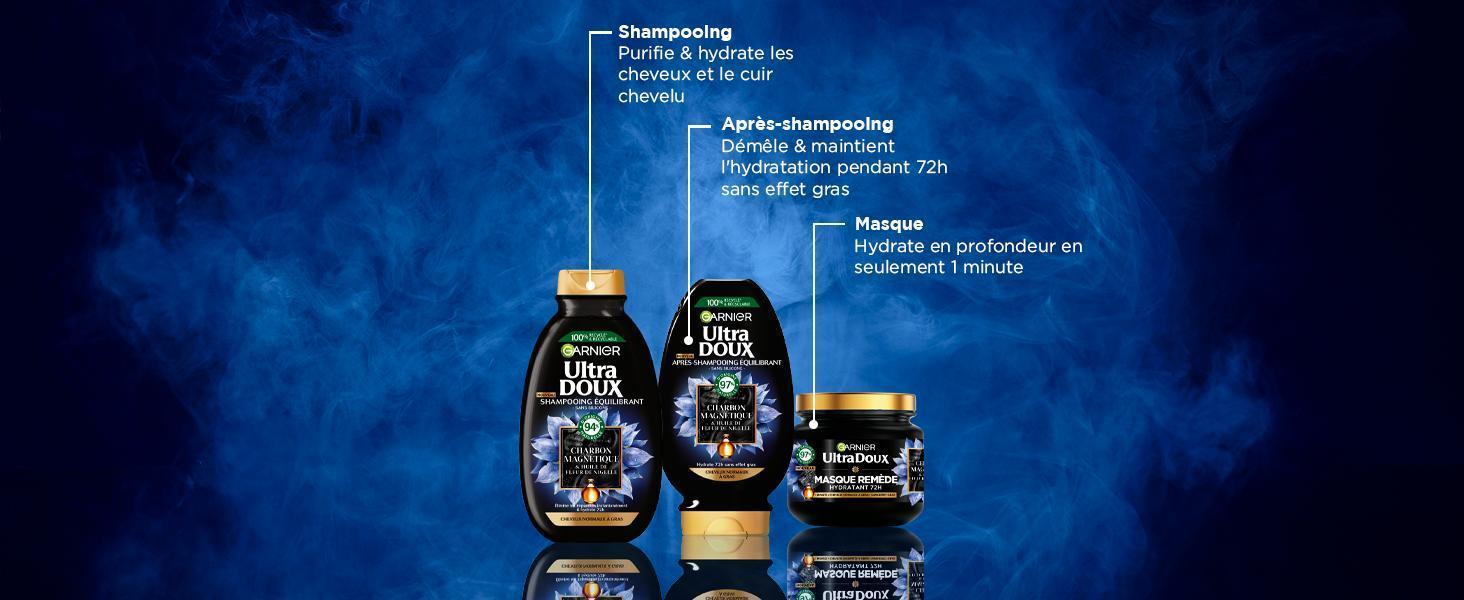 La gamme Charbon Magnétique de Garnier Ultra Doux a été conçue pour traiter les cheveux normaux à gras dont les longueurs ont besoin d'hydratation et le cuir chevelu d'une solution purifiante et équilibrante.