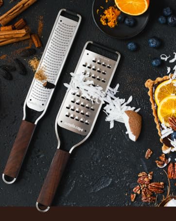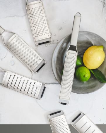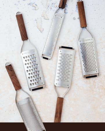 L'emblématique zesteur-râpe Premium Classic, reconnaissable grâce à sa silhouette longiligne et compacte, a révolutionné la façon de râper les aliments grâce à sa lame en acier inoxydable photogravée et tranchante comme une lame de rasoir - Made in USA. Avec ses 400 micro-dents, celle-ci est parfaite pour tous les agrumes, les fromages à pâte dure, le chocolat, le gingembre, l'ail, la noix de muscade, les truffes, les épices, les noix et bien plus encore.