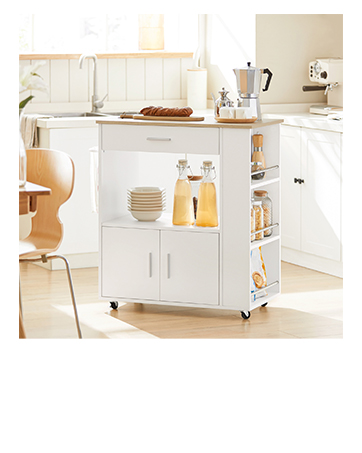 Chariot élégant en blanc ou noir, offrant rangement pour micro-ondes, étagères ouvertes et compartiments dissimulés. Son design mobile et ses roulettes le rendent parfait pour les petits espaces.
