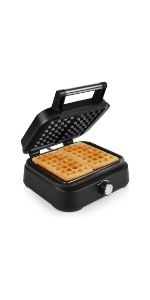 Ce gaufrier, doté d’une surface de cuisson de 19,8 x 19,8 cm et vous permet de préparer deux grandes gaufres belges aux dimensions généreuses (4 carrés de pâte en largeur pour 7 en longueur) à la fois. Garnissez-les ensuite comme vous le souhaitez.