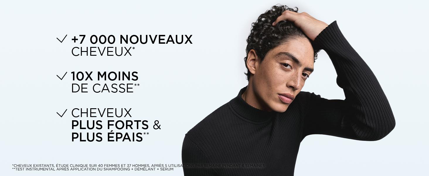 Association du shampooing, démêlant et sérum : des cheveux plus forts et volumineux.