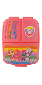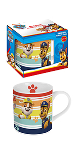 Les couverts en acier inoxydable contiennent une fourchette, un couteau, une cuillère à soupe et une cuillère à thé. Les poignées en plastique sont de couleur bleu clair, rouge, jaune et vert et sont imprimées avec les héros de Pat'Patrouille, Marshall, Rubble et Rocky.